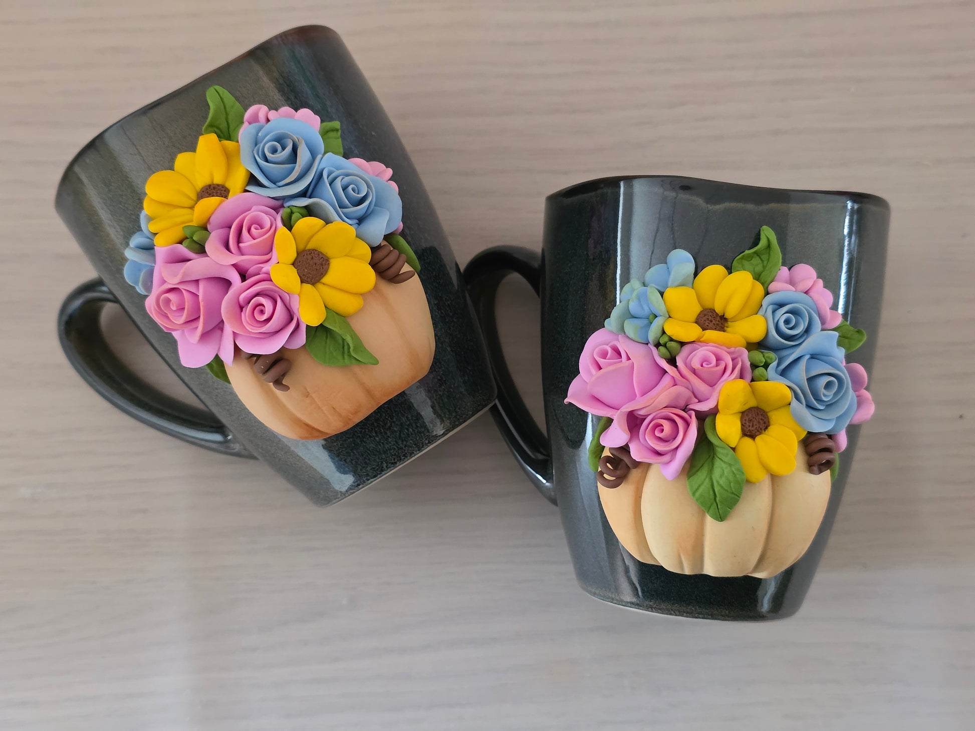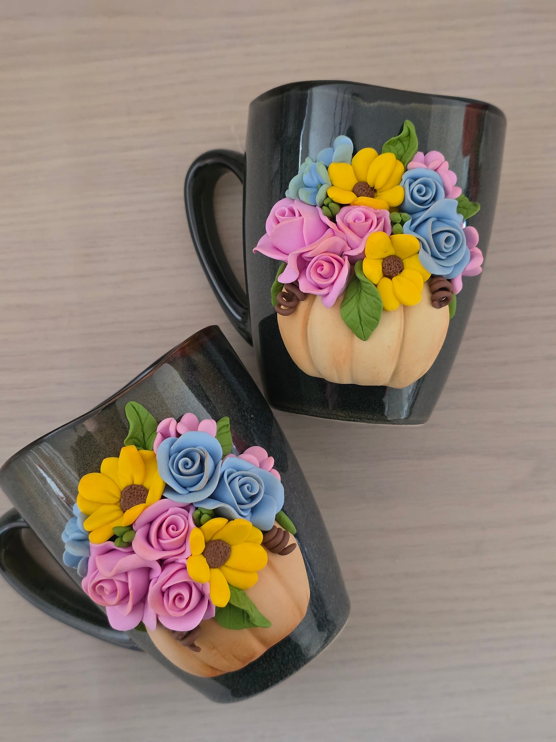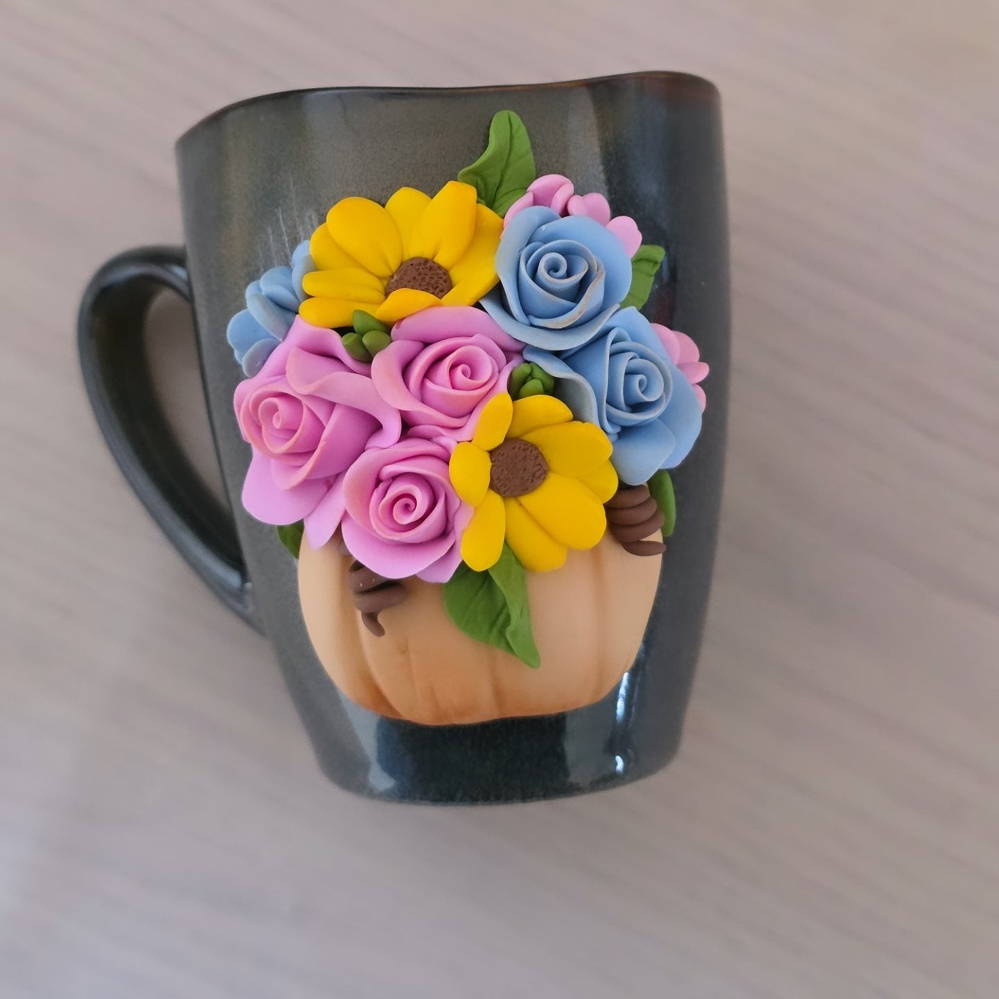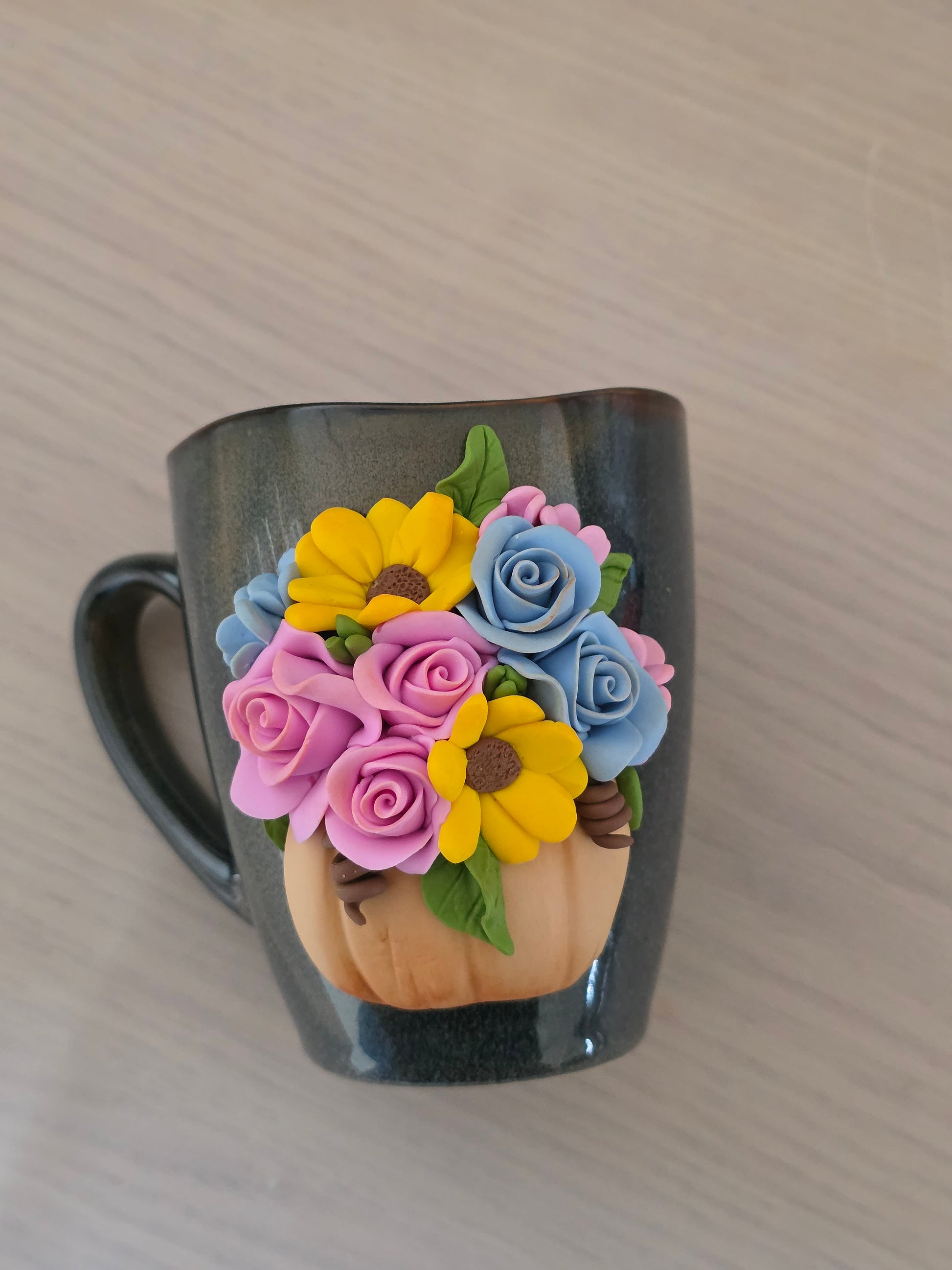 Cana 300ml, decorată cu flori confecționate manual din lut polimeric (fimo).
